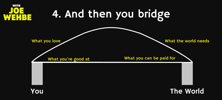 On the other end of the equation, coming from you are the things you love that might be more than a one-off hobby (what you’re good at). (Note, you find what these things are by doing interest mapping and answering the Audience-of-None question).