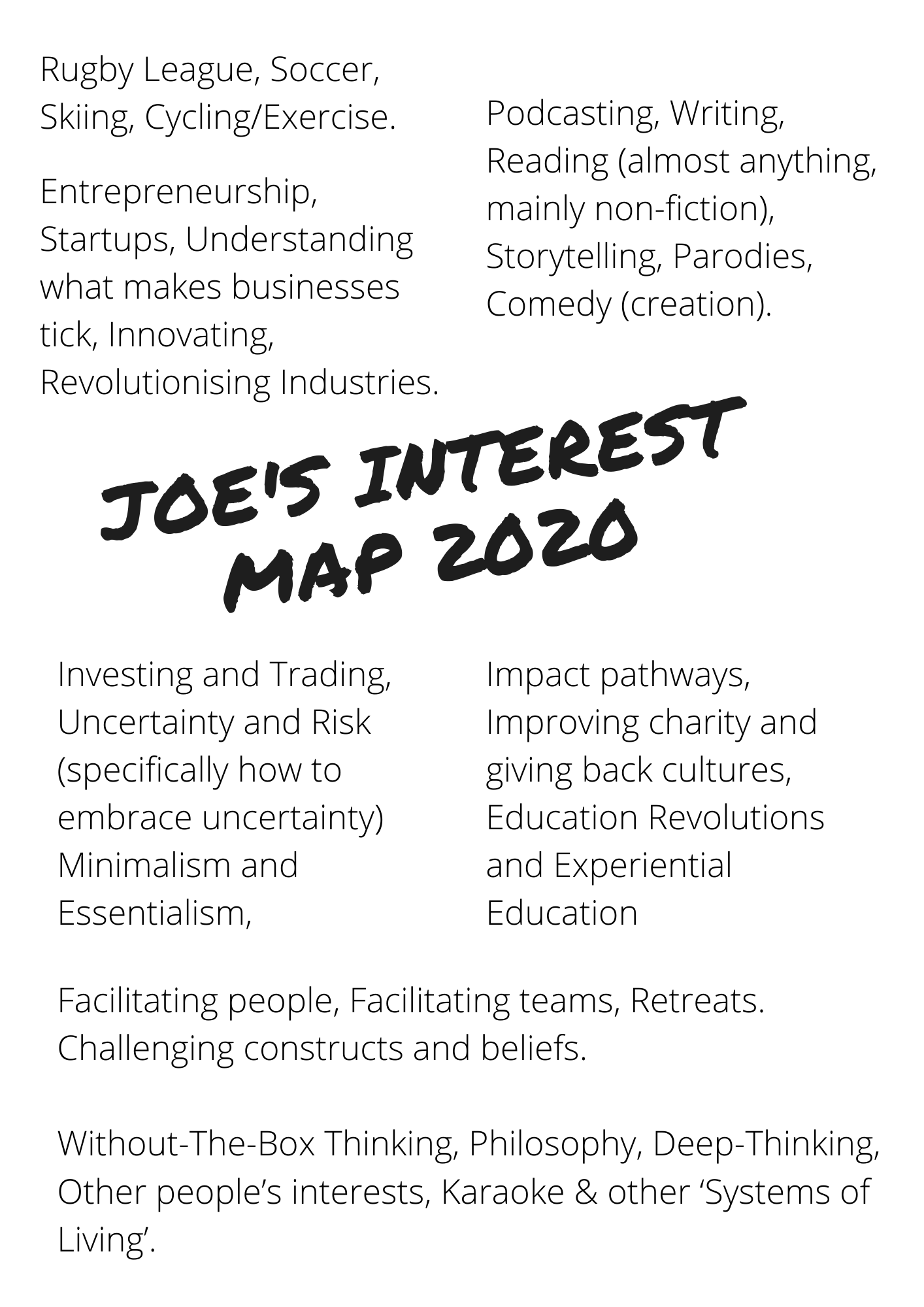 Hey Joe, thanks for the opportunity to share what my interest map would have looked like in 2012. As I said in my chapter in the book, I had a bit of a limited outlook back then. I think these would have been my interests…