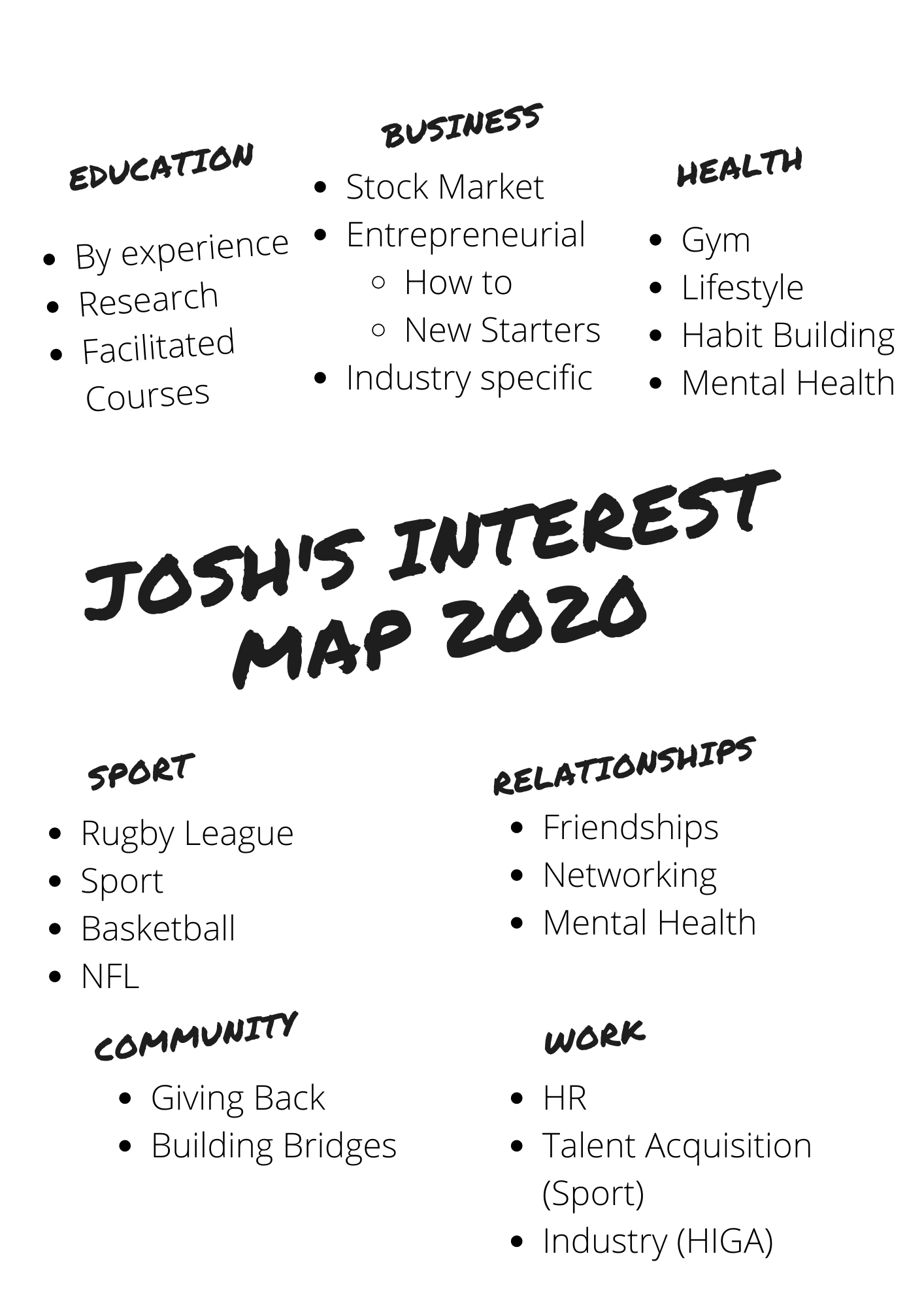 I asked Josh to compare this to his 2020 interest map. For context, Josh and I also did this exercise together at a retreat I ran before we started the book project.