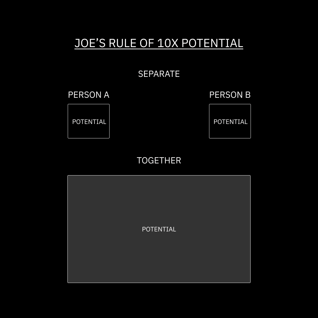 I have the rule of thumb that when two people find a way to effectively and deeply collaborate together, they 10x or 100x their potential.