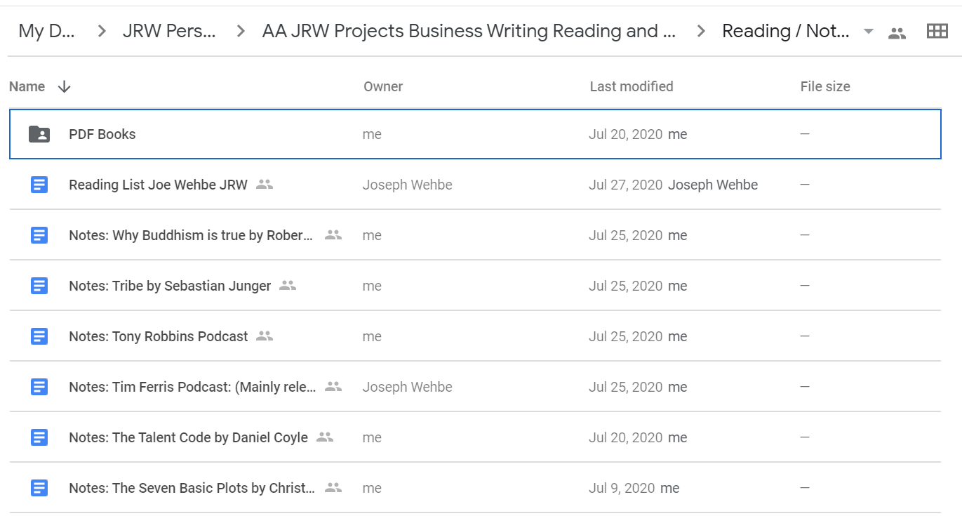I have a whole folder of separate google docs for every book I read. I also include podcasts and other short texts I read whose information I want to harvest, encode more deeply and access easily in future. Here is a snapshot: